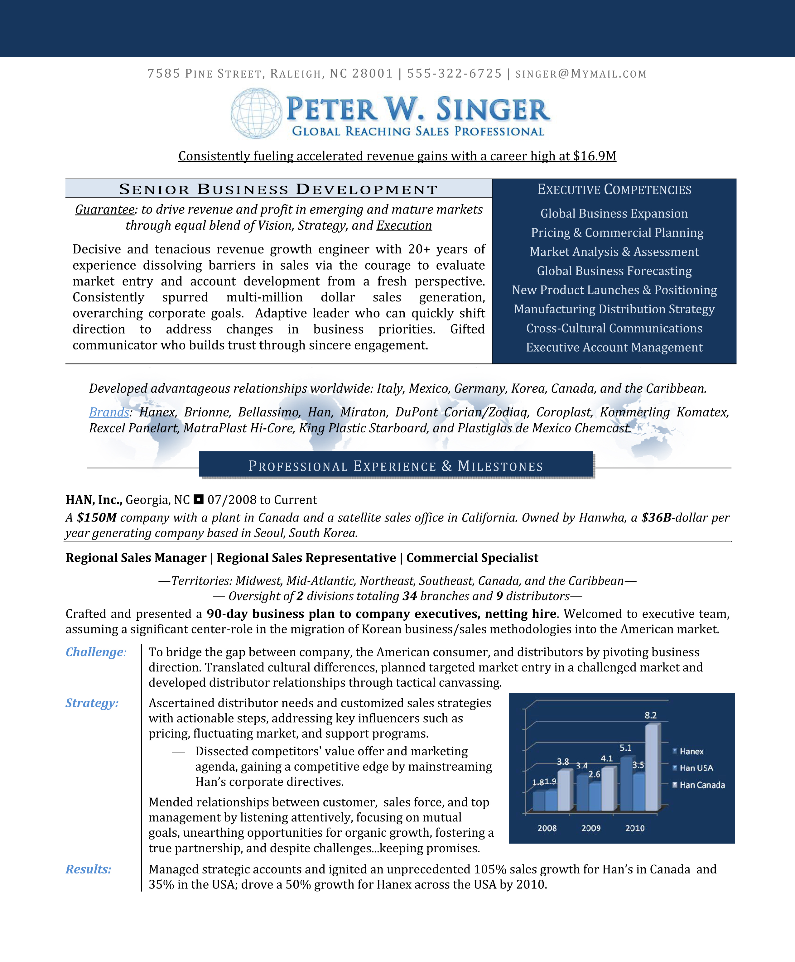 We write conservative, modern, and creative resumes. This particular client requested a modern resume with a graphics. He wanted to emphasize his global reach and revenue generation.