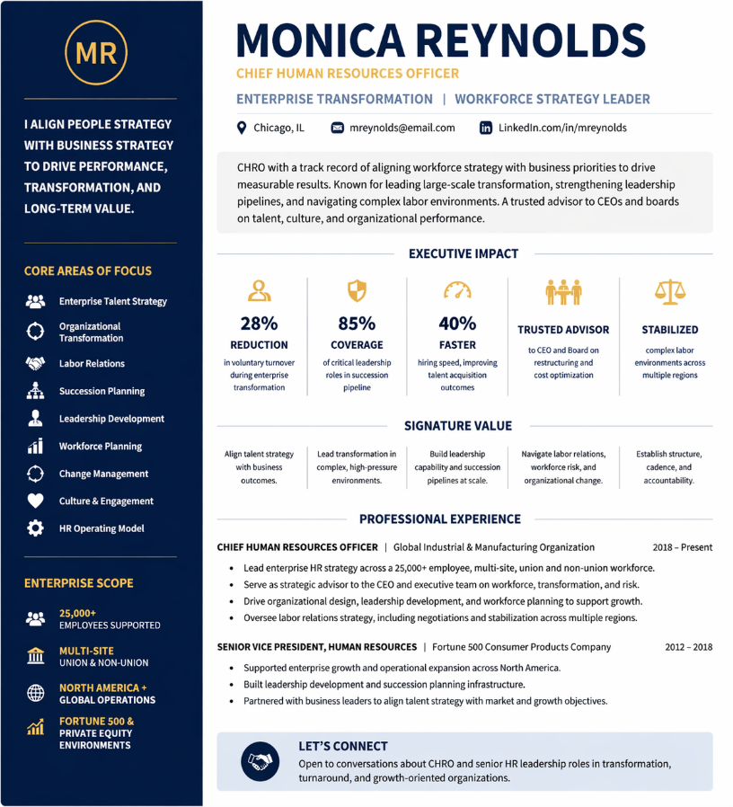 “The CHRO who reduced turnover 28% during transformation and built leadership coverage across 85% of the organization.”